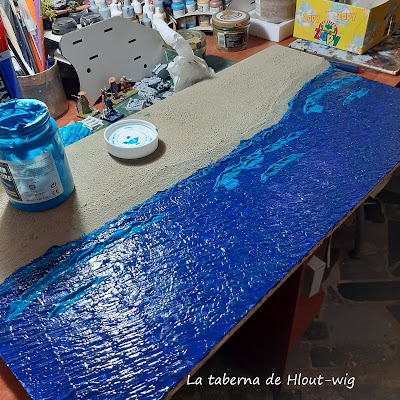 Y aquí el tablero al completo, la gran diferencia de tono, sobre todo la línea taaan recta, la disimularé pintando un poco la playa de tonos marrones siguiendo un línea irregular. Pero quería ver el tablero en su totalidad.